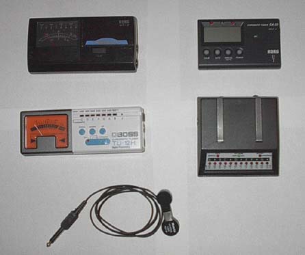 A tuner is an electronic device that receives a tone and displays a readout of its pitch through a graphic display of LEDs and/or a needle-type meter. A tuner is a must unless you have perfect pitch and a lot of patience. Just make sure you get a chromatic model.